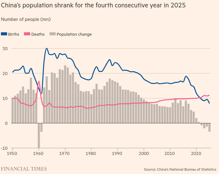 China’s fertility rate is now 0.98, far below the 2.1 needed for the population to remain stable (ft, thestandard).
